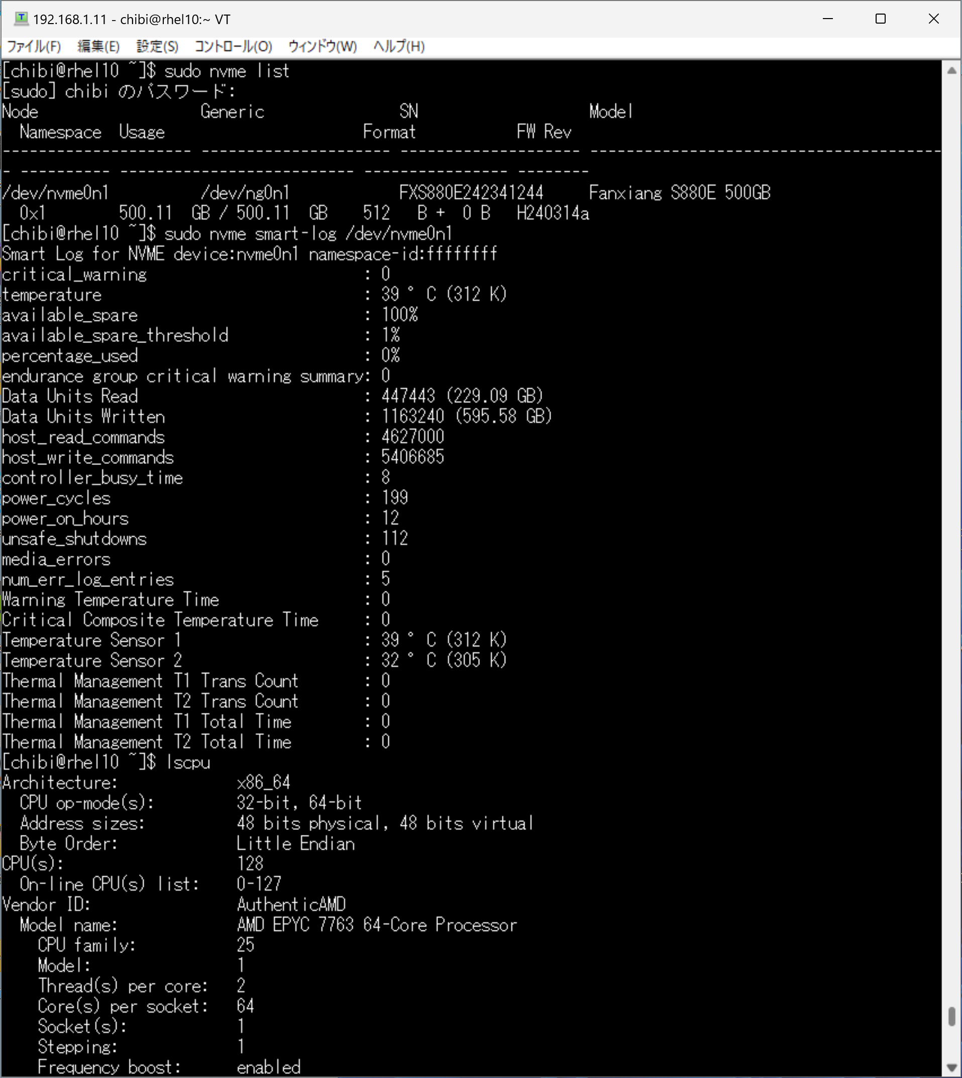 nvme list sensors nvme smart-log /dev/nvme0n1 lscpu AMD EPYC 7763 64-Core Processor 128Threads