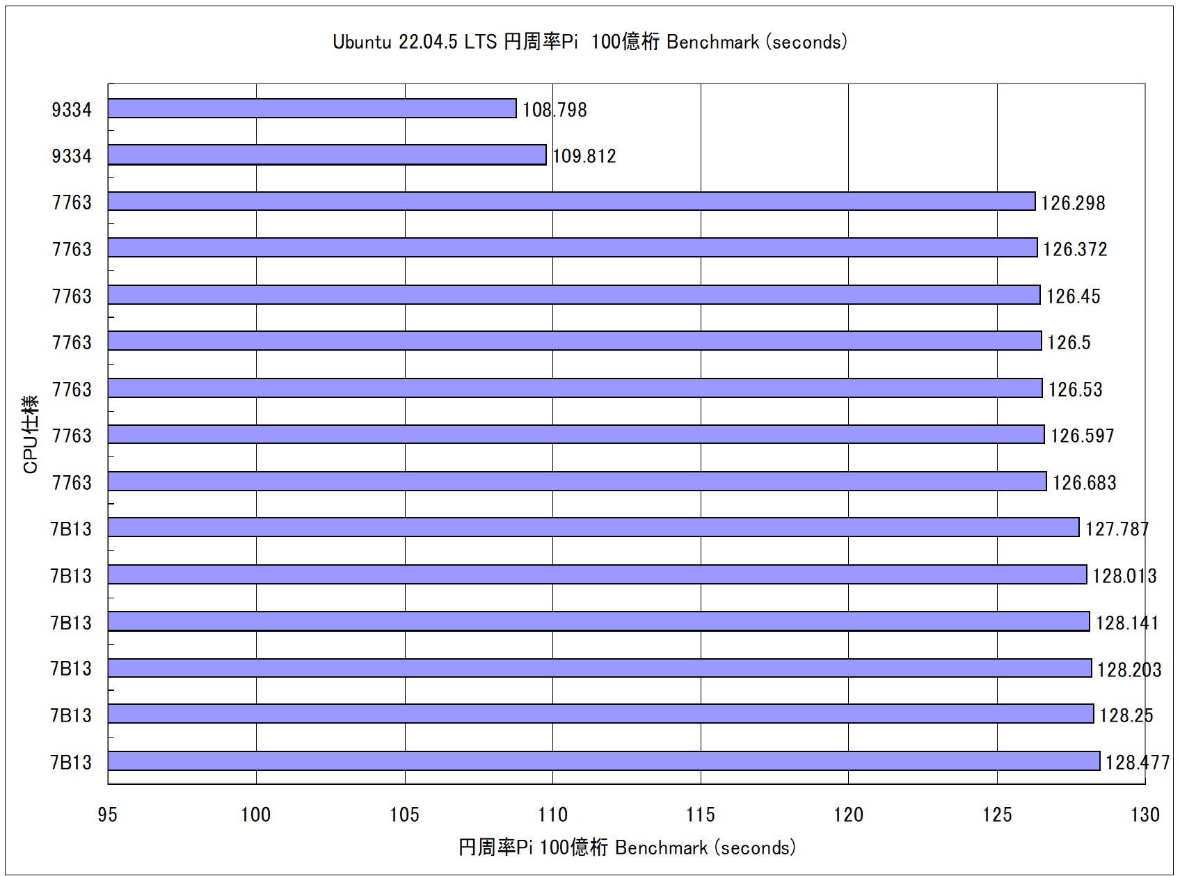 AMD EPYC 9334 32-Core Processor 円周率 Pi 100億桁のBenchMark 108.798 seconds データ詳細