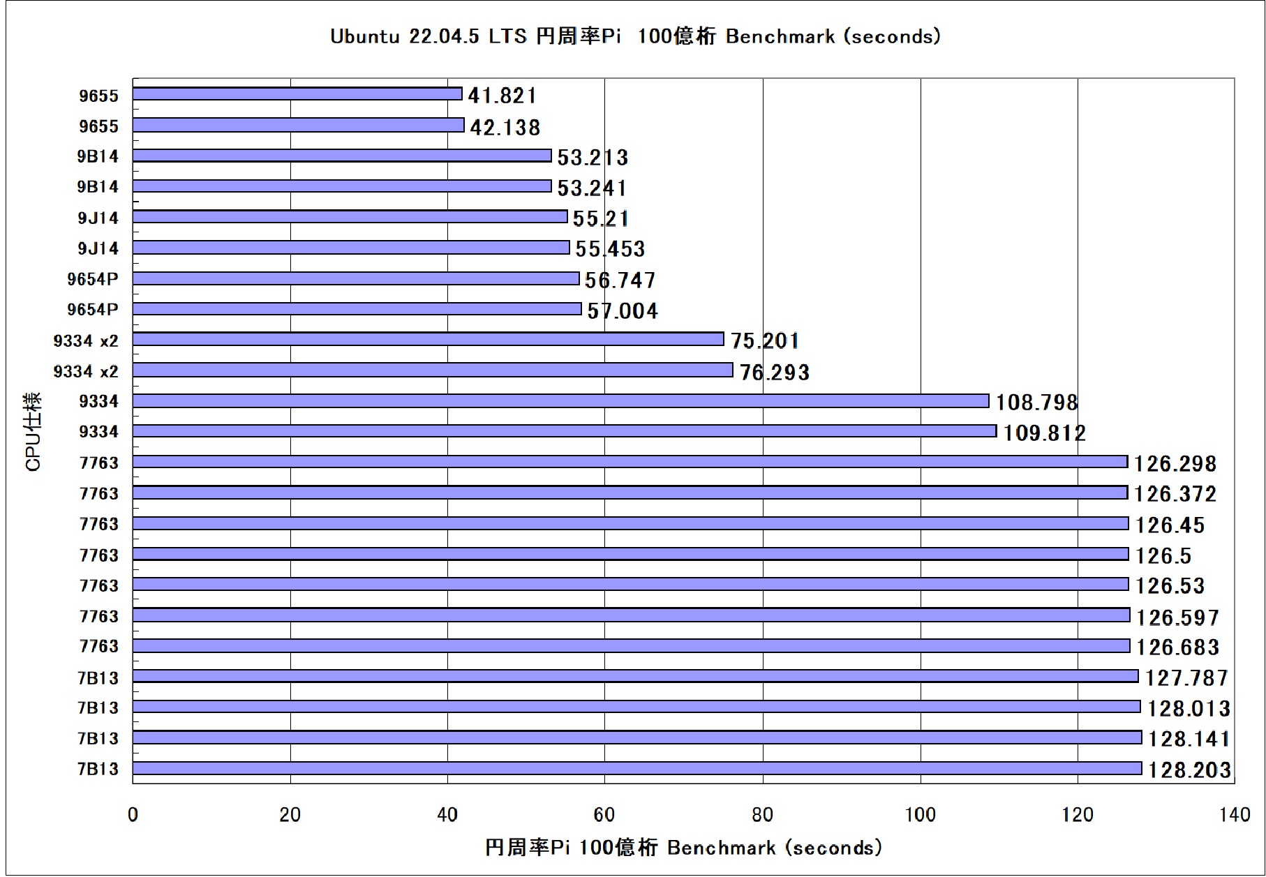 ←小さいほど短時間 AMD EPYC 9655 96-Core Processr 192Threads 2.6GHZ AMD EPYC 9334 32-Core Processr 64Thread 2.7GHZ AMD EPYC 7763 64-Core Processor 128Threads 2.4GHZ AMD EPYC 7B13 64-Core Processor 128Threads 2.2GHZ