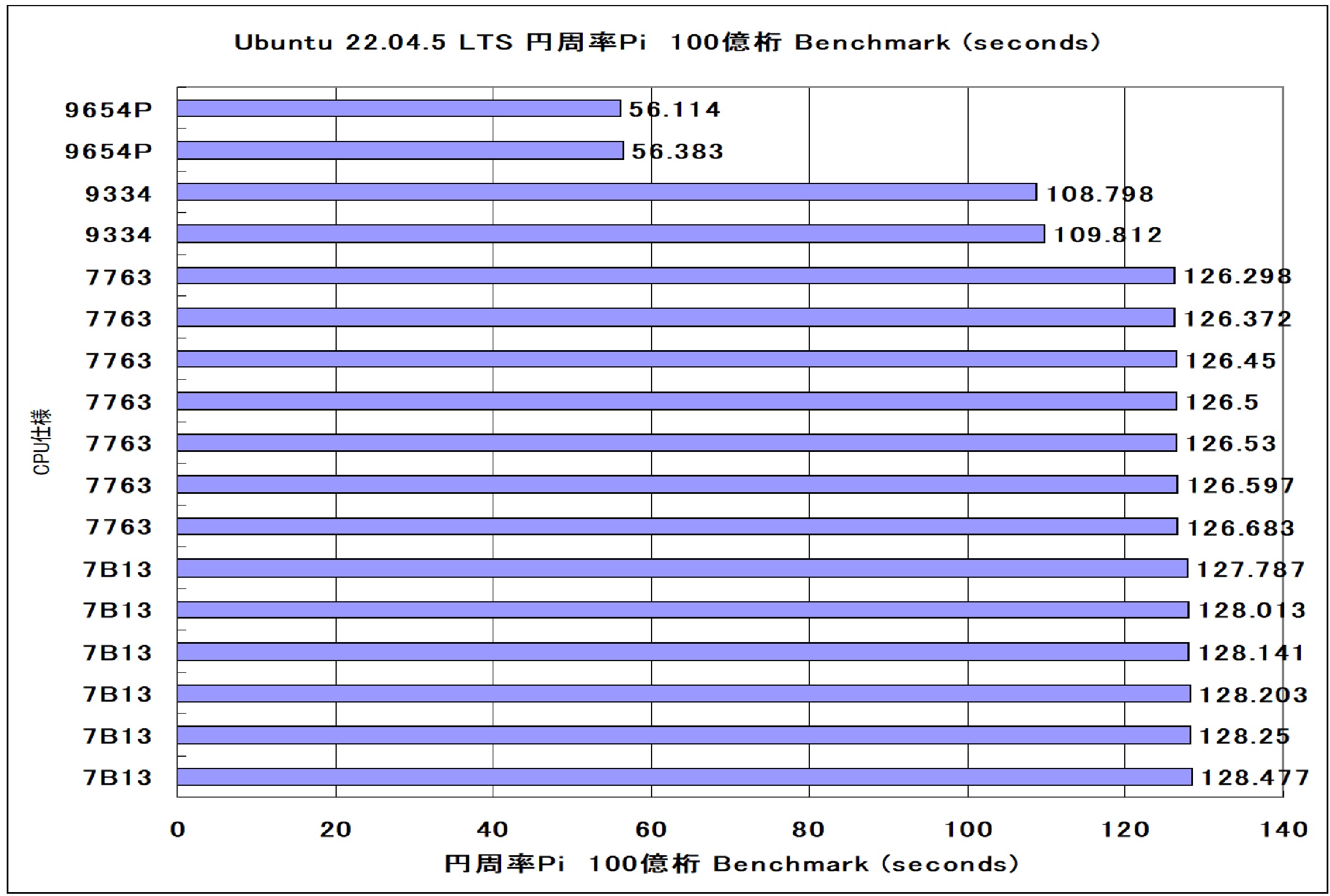 ←小さいほど短時間 AMD EPYC 964P 96-Core Processr 192Threads 2.4GHZ AMD EPYC 9334 32-Core Processr 64Thread 2.7GHZ AMD EPYC 7763 64-Core Processor 128Threads 2.4GHZ AMD EPYC 7B13 64-Core Processor 128Threads 2.2GHZ