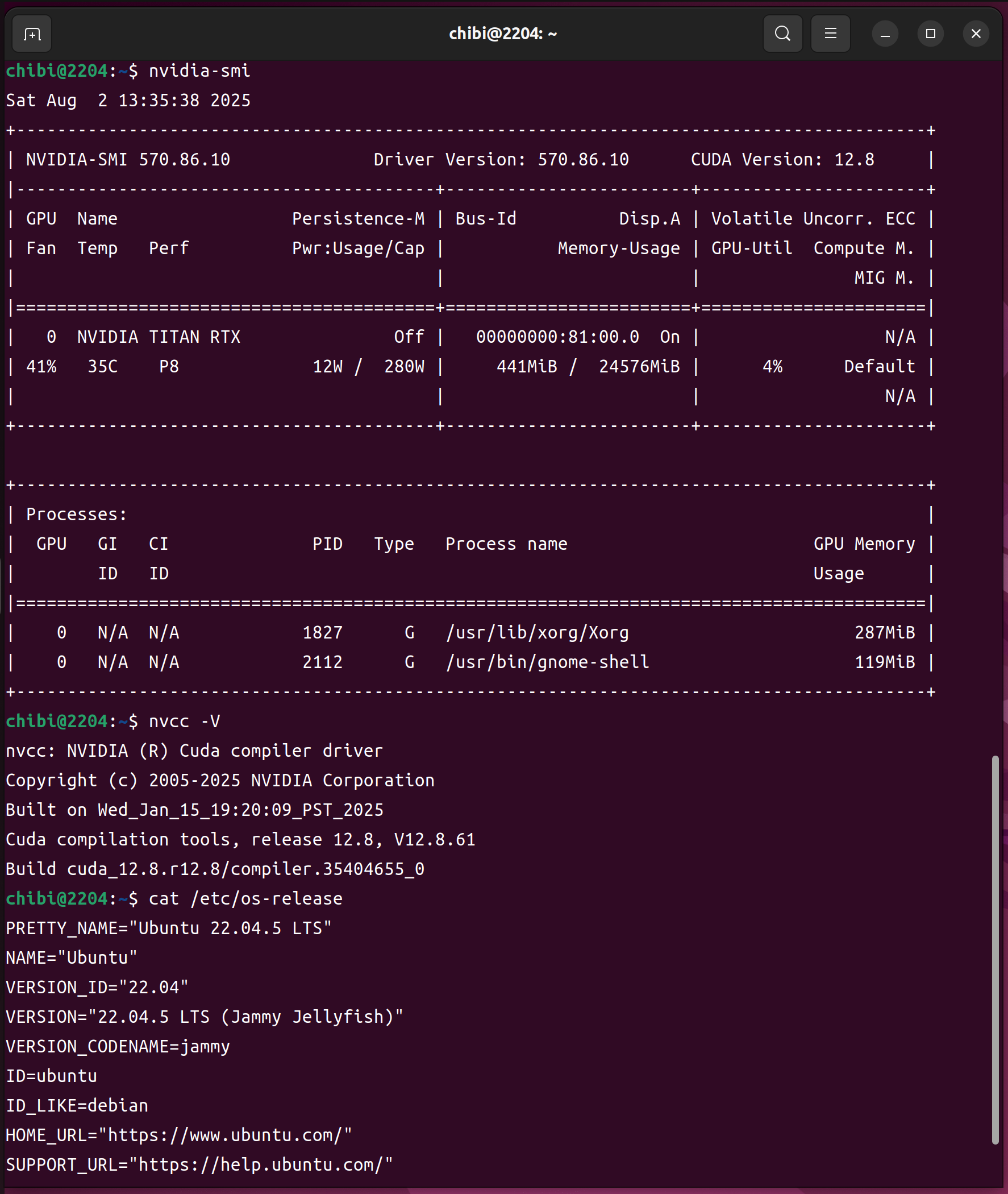 - Intel(R) Core(TM) i7-6700K CPU @ 4.00GHz 4core 8threds 32GB RTX2080Ti PLEXTOR PX-256M9PeGで構成されたUbuntu24.04.3 LTS へ CUDA-toolkit 12.5をInstall してnvidia-smi nvcc -V cat /etc/os-release sensors lsmem nvme list nvme smart-log /dev/nmve0n1 lscpuを設定 に 丸山泰男 より