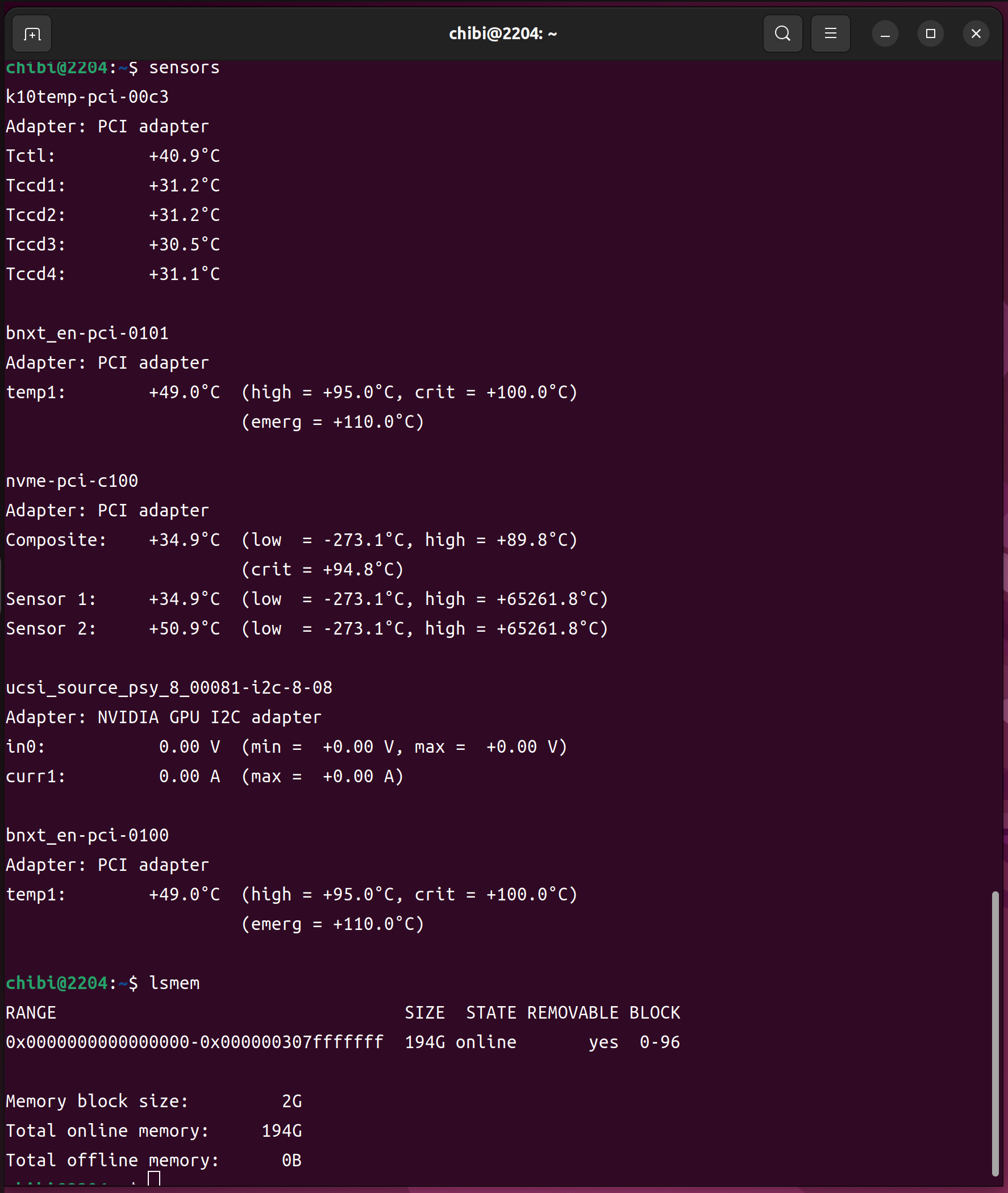 - 第4世代 AMD EPYC 9334 32-Core Processor 64Threads 384GB TITAN RTX Fanxiang S500Pro 256GB で構成された Ubuntu 22.04.5 LTS へ CUDA-toolkit 12.8.0をInstall して nvidia-smi nvcc -V cat /etc/os-release sensors lsmem nvme list nvme-smart-log /dev/nvme0n1 lscpuを設定してみた