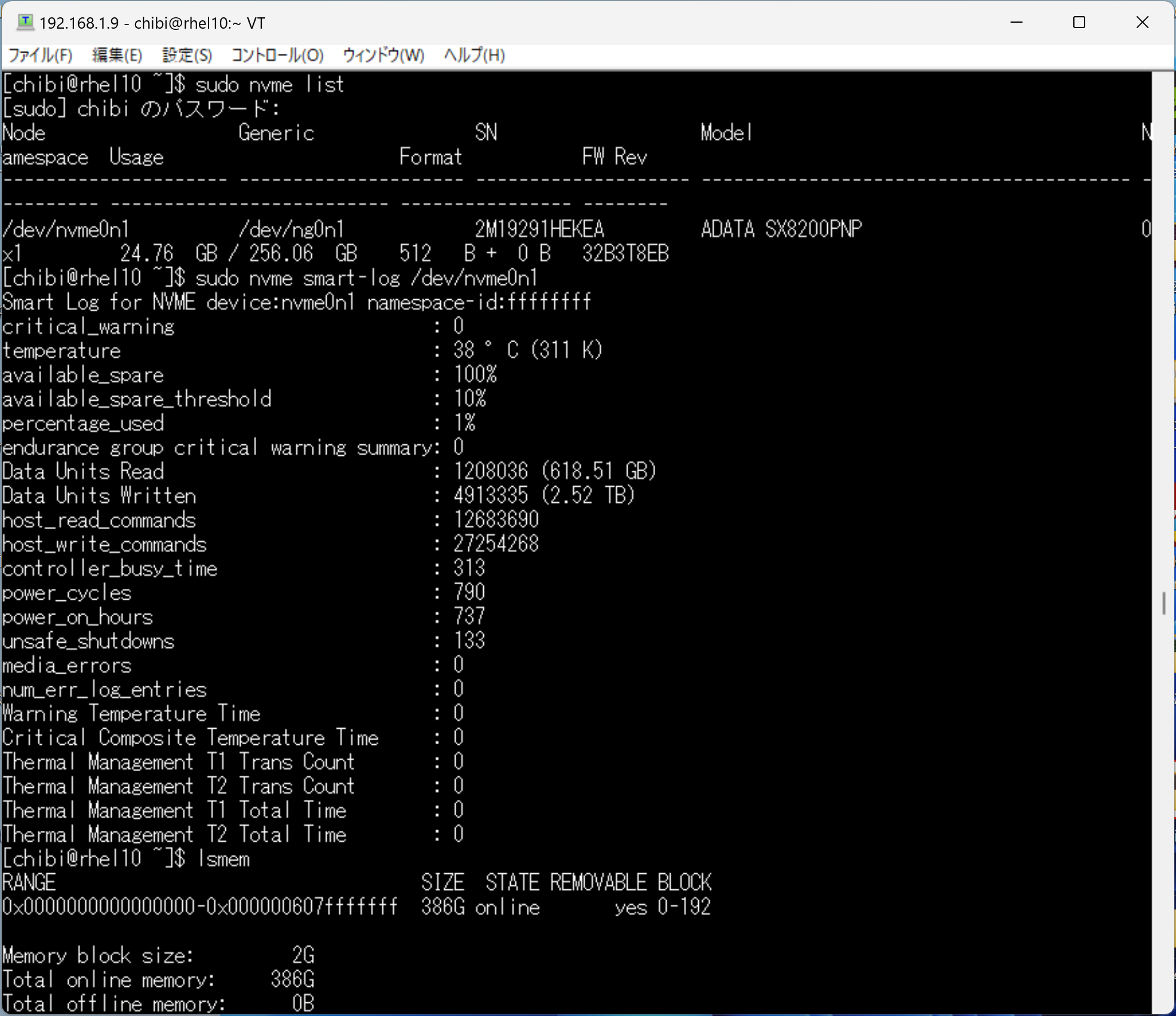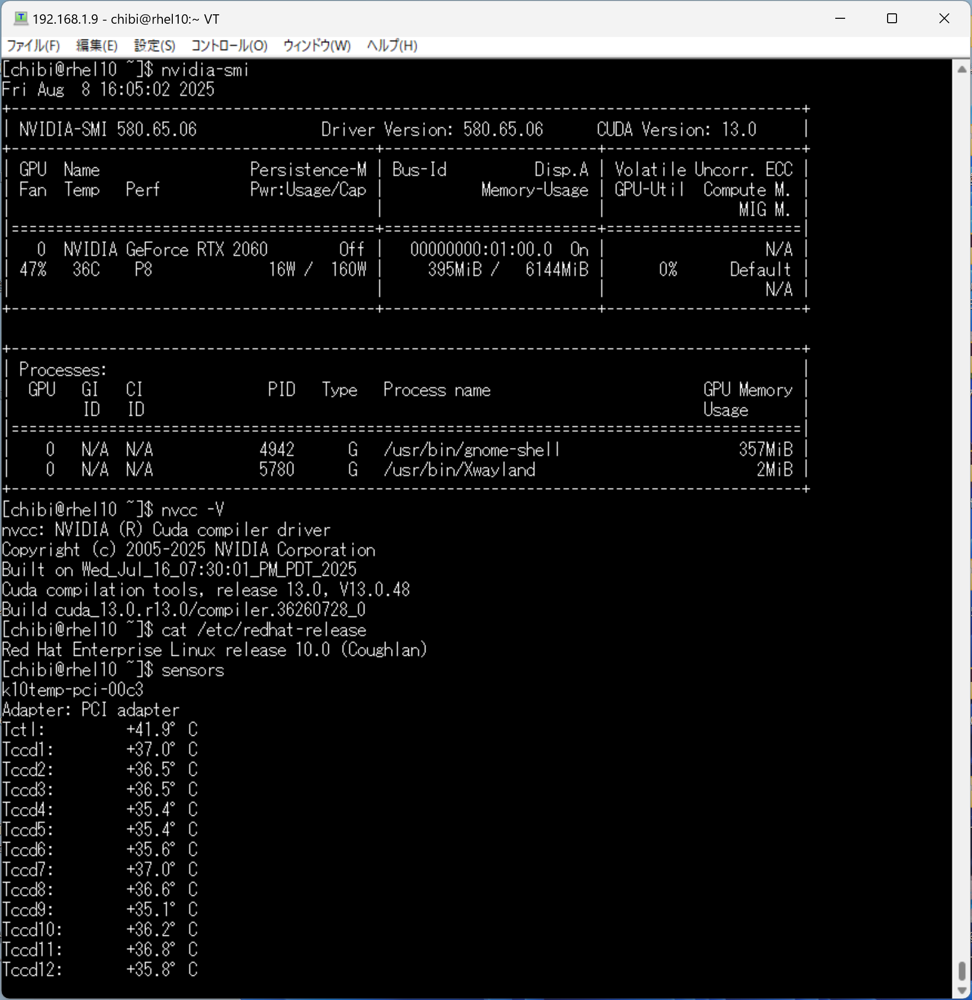 - 第4世代 AMD EPYC 9J14 96-Core Processor 192Threads 384GB TITAN RTX ADATA SX8200PNP 256GB で構成された Red Hat Enterprise Linux release 10.0 へ CUDA-toolkit 13.0をInstall して nvidia-smi nvcc -V cat /etc/redhat-release sensors lsmem nvme list nvme-smart-log /dev/nvme0n1 lscpuを設定してみた