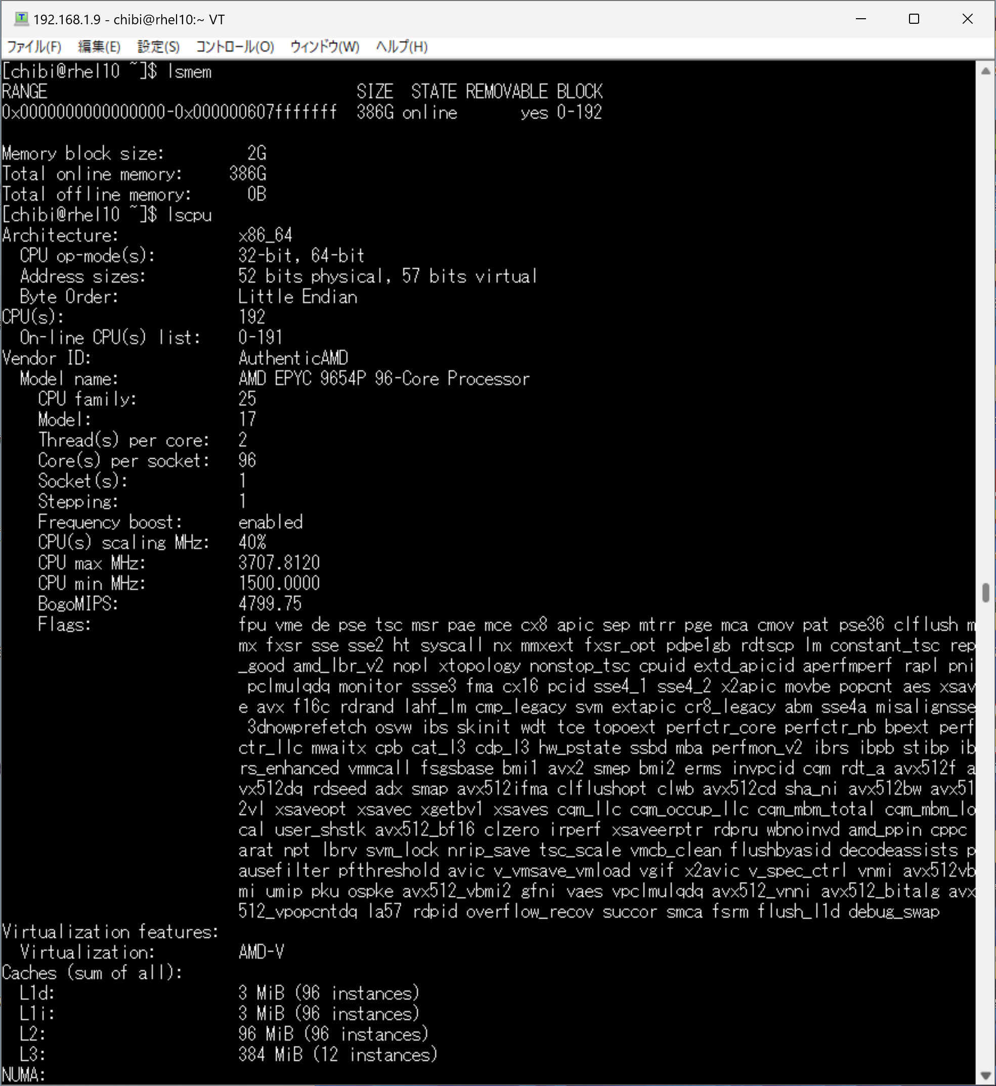 lsmem 384GB lscpu AMD EPYC 9564P 96-Core Processor 192Threads