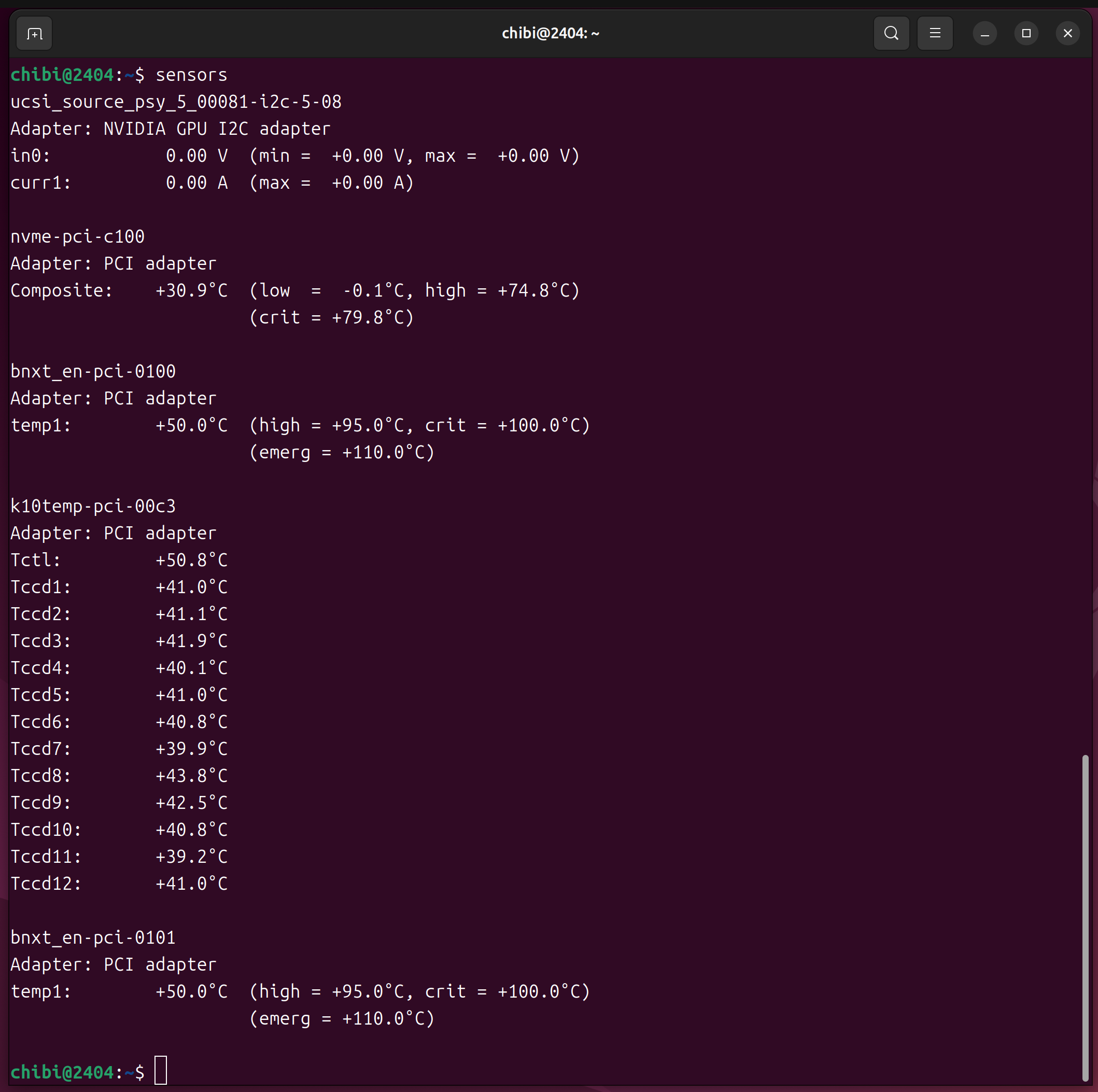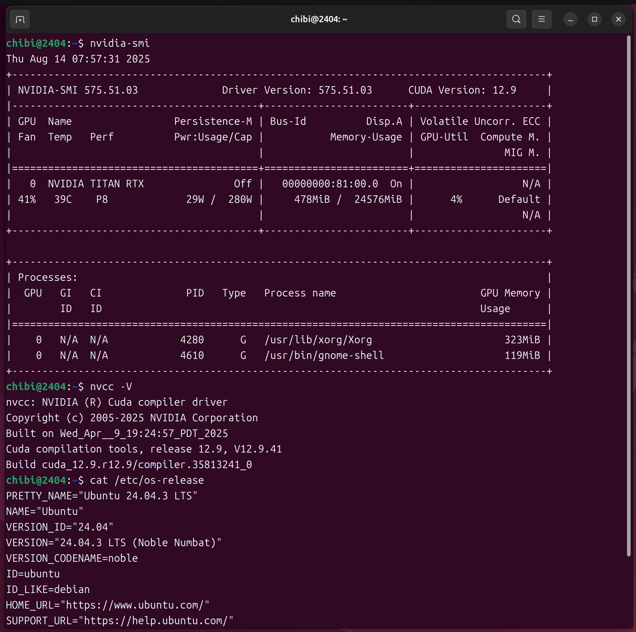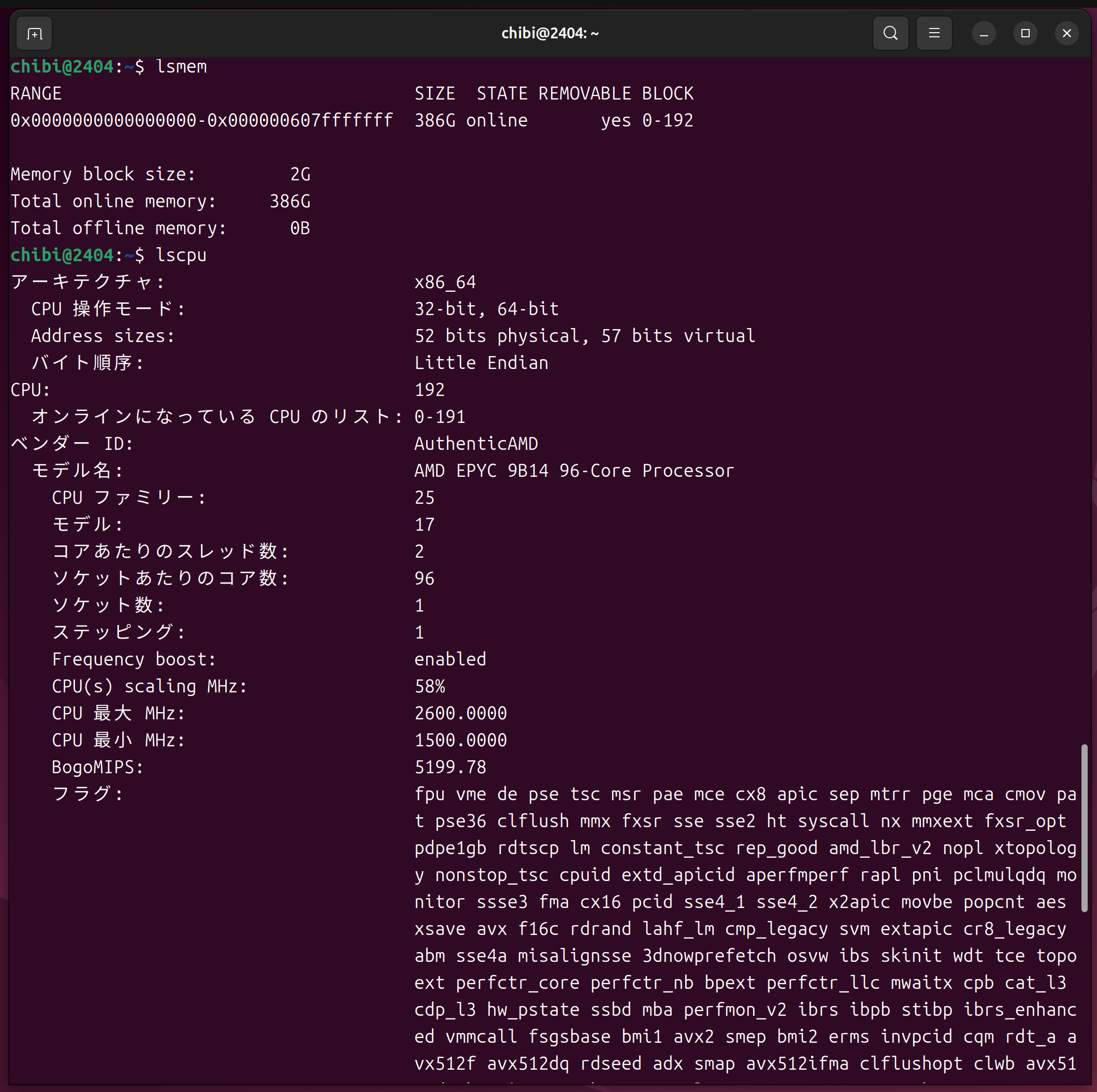 - 第4世代 AMD EPYC 9B14 96-Core Processor 192Threads 384GB TITAN RTX ADATA SX8200PNP 256GB で構成された Ubuntu 24.04.3 LTS へ CUDA-toolkit 12.9をInstall して nvidia-smi nvcc -V cat /etc/os-release sensors nvme list nvme-smart-log /dev/nvme0n1 lsmem lscpuを設定してみた