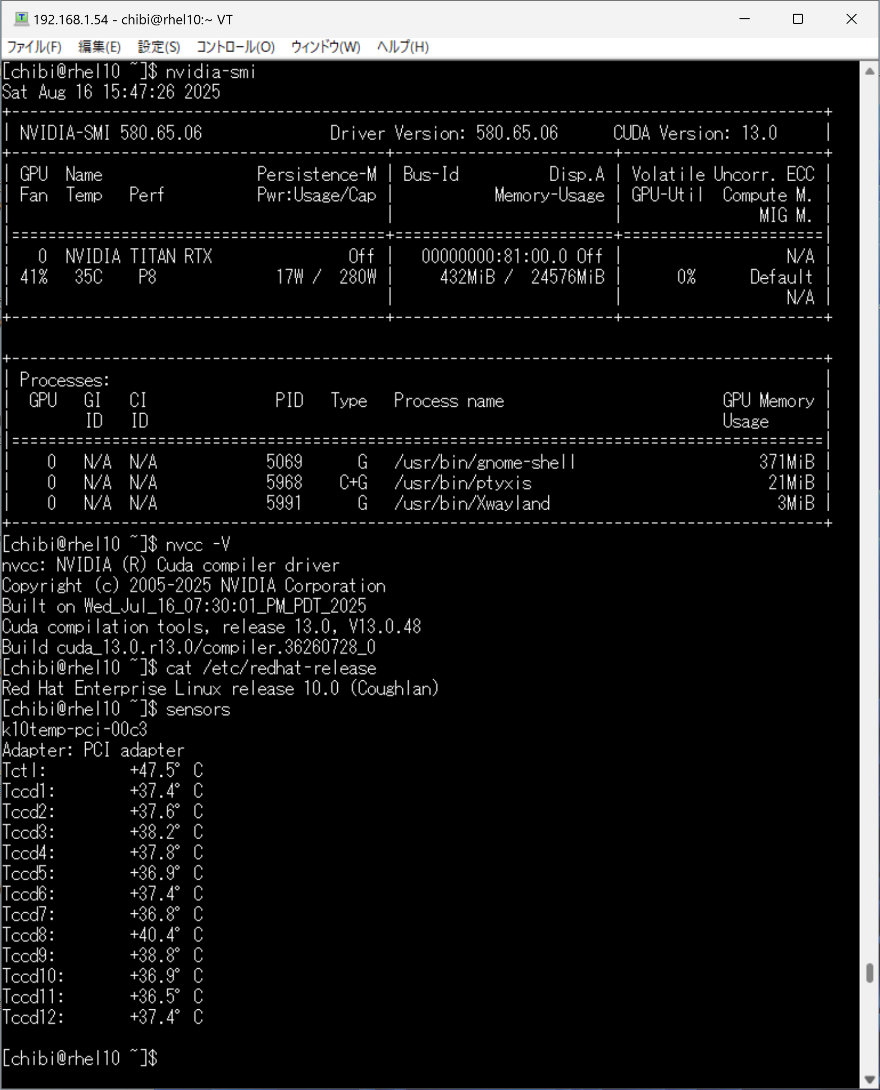 - 第4世代 AMD EPYC 9B14 96-Core Processor 192Threads 384GB TITAN RTX ADATA SX8200PNP 256GB で構成された Red Hat Enterprise Linux release 10.0 へ CUDA-toolkit 13.0をInstall して nvidia-smi nvcc -V cat /etc/redhat-release sensors lsmem nvme list nvme-smart-log /dev/nvme0n1 lscpuを設定してみた