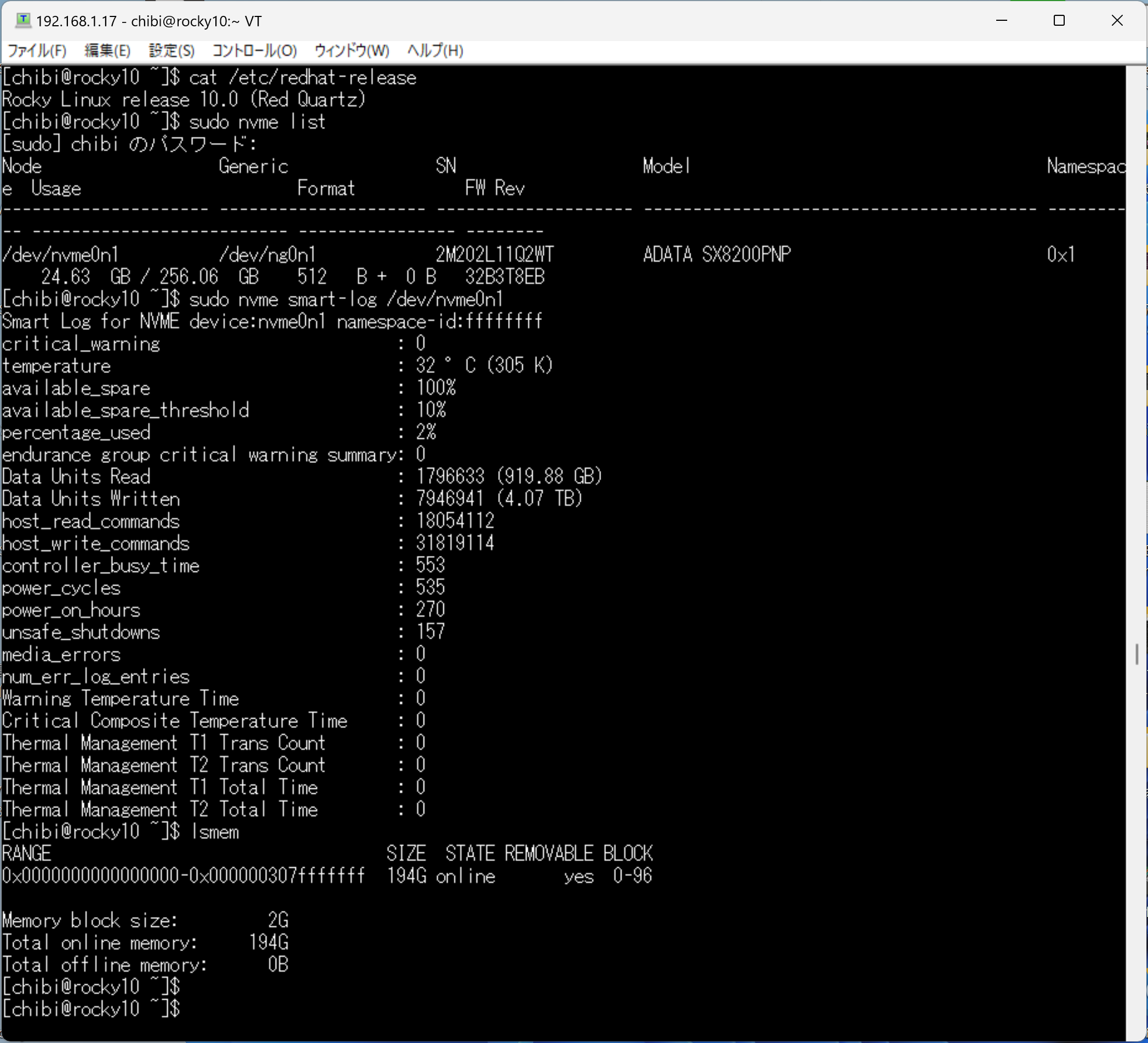 cat /etc/redhat-release nvme list nvme-smart-log /dev/nvme0n1 lsmem