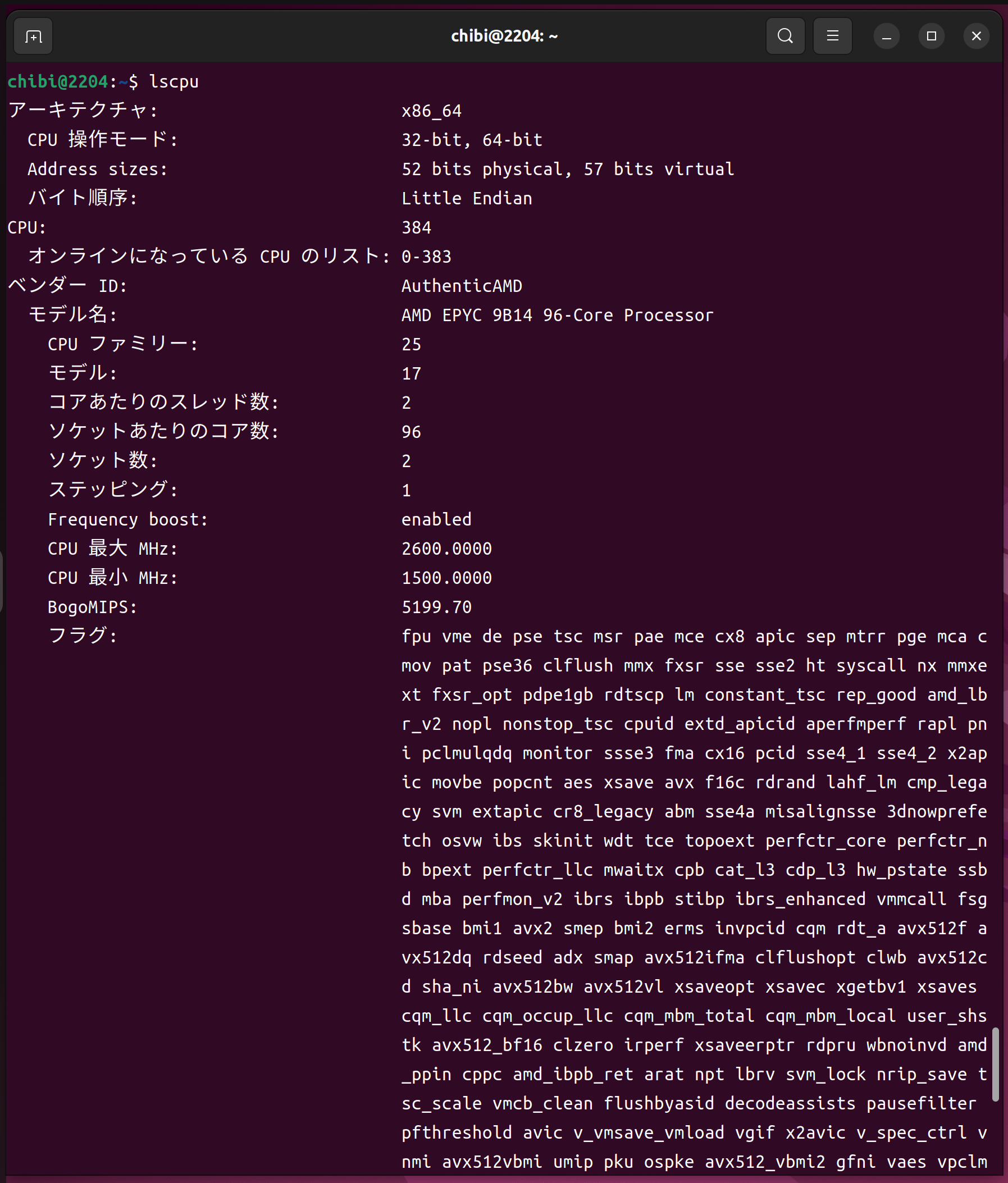 lscpu AMD EPYC 9B14 96-Core Processor x2 382Threads