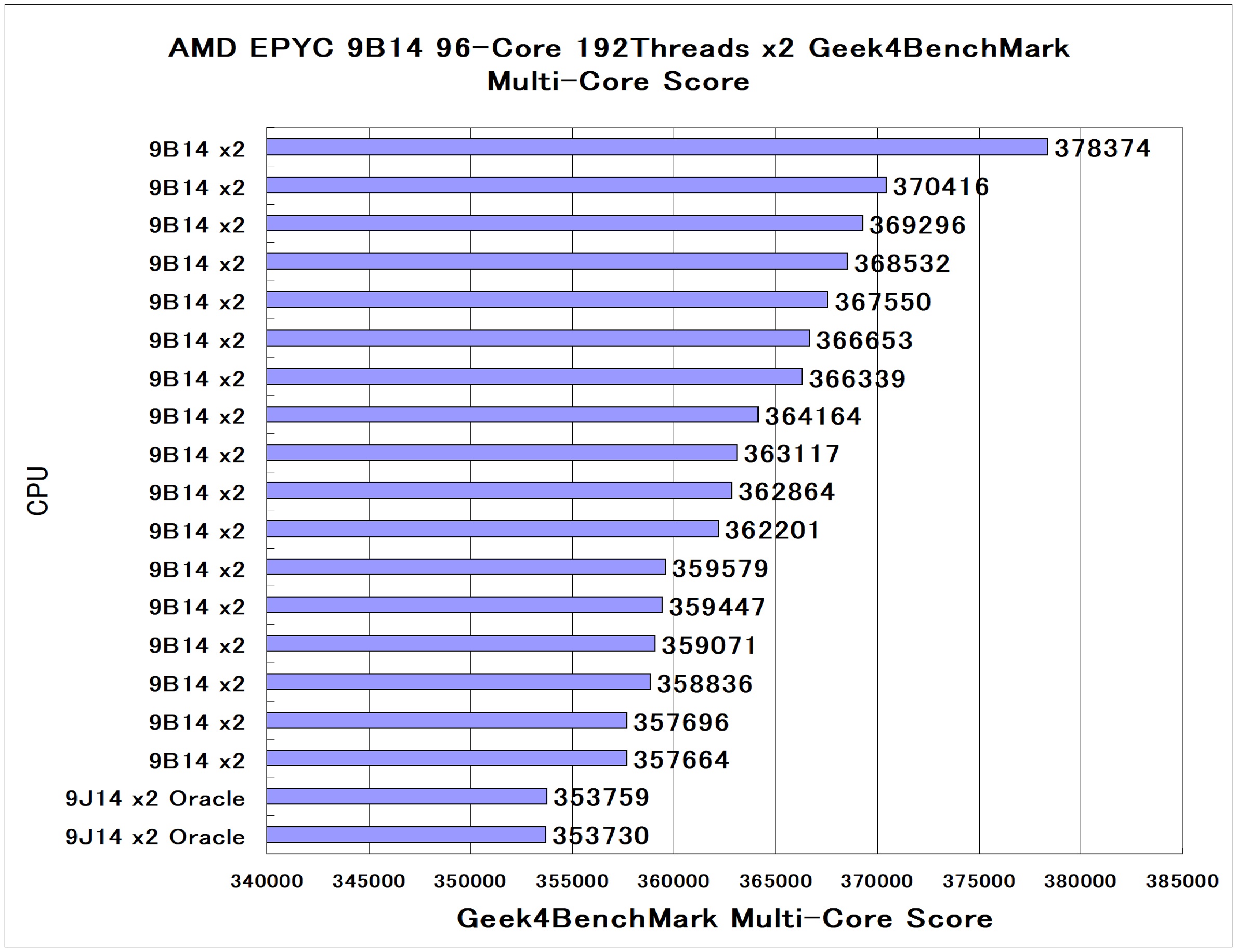 第4世代 AMD EPYC 9B14 96-Core Processor x2個 Multi-Core Score 378374