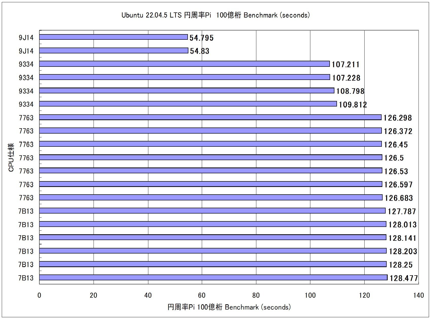← 小さいほど短時間 AMD EPYC 9J14 96-Core Processr 192Thread 2.4GHZ AMD EPYC 9334 32-Core Processr 64Thread 2.7GHZ AMD EPYC 7763 64-Core Processor 128Threads 2.4GHZ AMD EPYC 7B13 64-Core Processor 128Threads 2.2GHZ