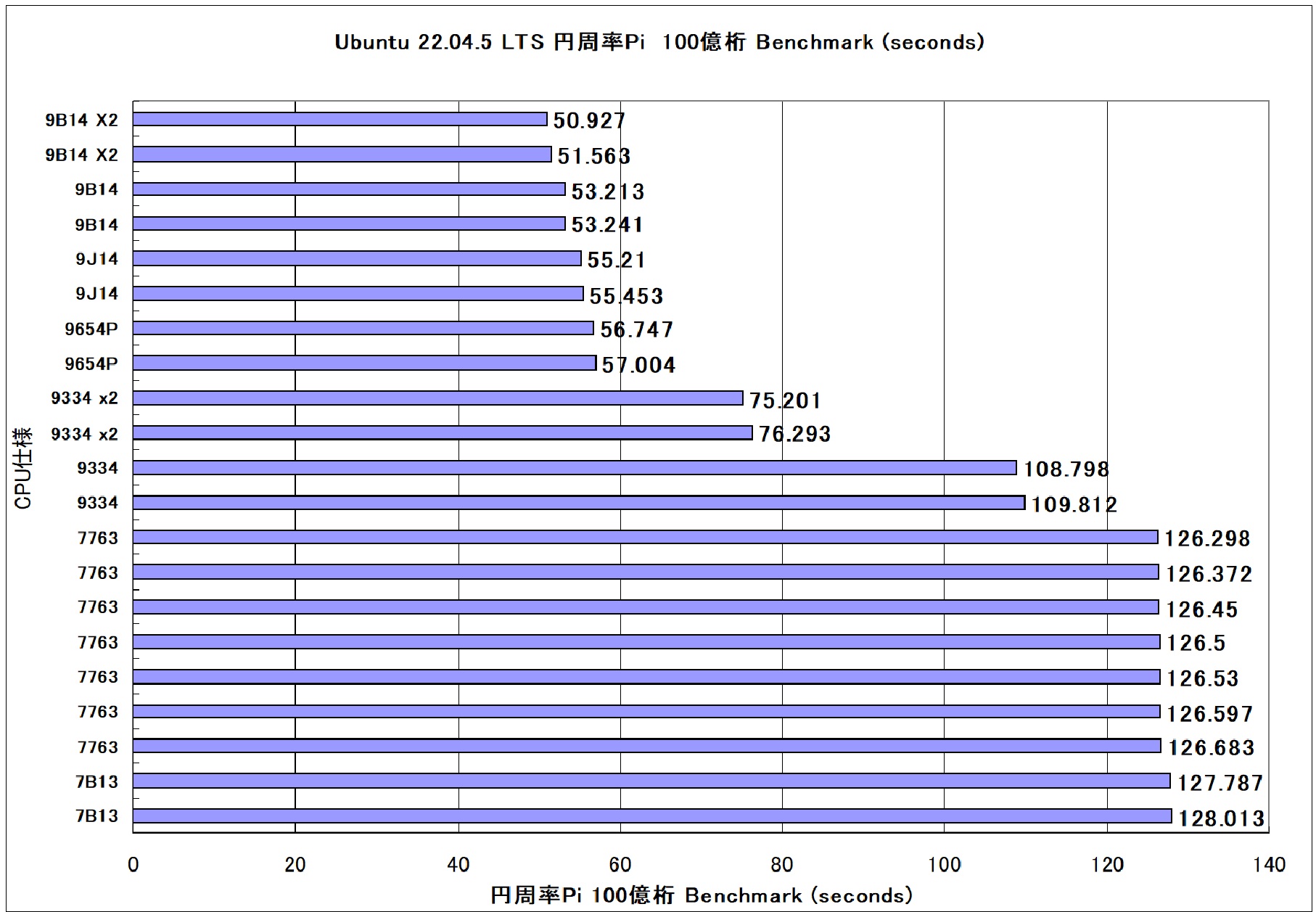 ←小さいほど短時間 AMD EPYC 9B14 96-Core Processrx2 384 Threads 2.6GHZ AMD EPYC 9334 32-Core Processr 64Thread 2.7GHZ AMD EPYC 7763 64-Core Processor 128Threads 2.4GHZ AMD EPYC 7B13 64-Core Processor 128Threads 2.2GHZ
