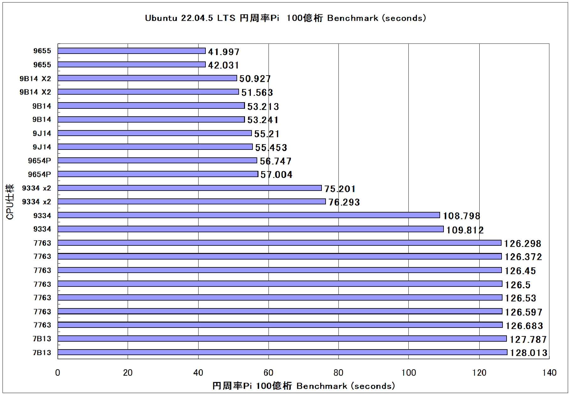 ←小さいほど短時間 AMD EPYC9655 96-Core Processor 192Threads 2.6GHZ AMD EPYC 9B14 96-Core Processr 192Threads 2.6GHZ AMD EPYC 9334 32-Core Processr 64Thread 2.7GHZ AMD EPYC 7763 64-Core Processor 128Threads 2.4GHZ AMD EPYC 7B13 64-Core Processor 128Threads 2.2GHZ