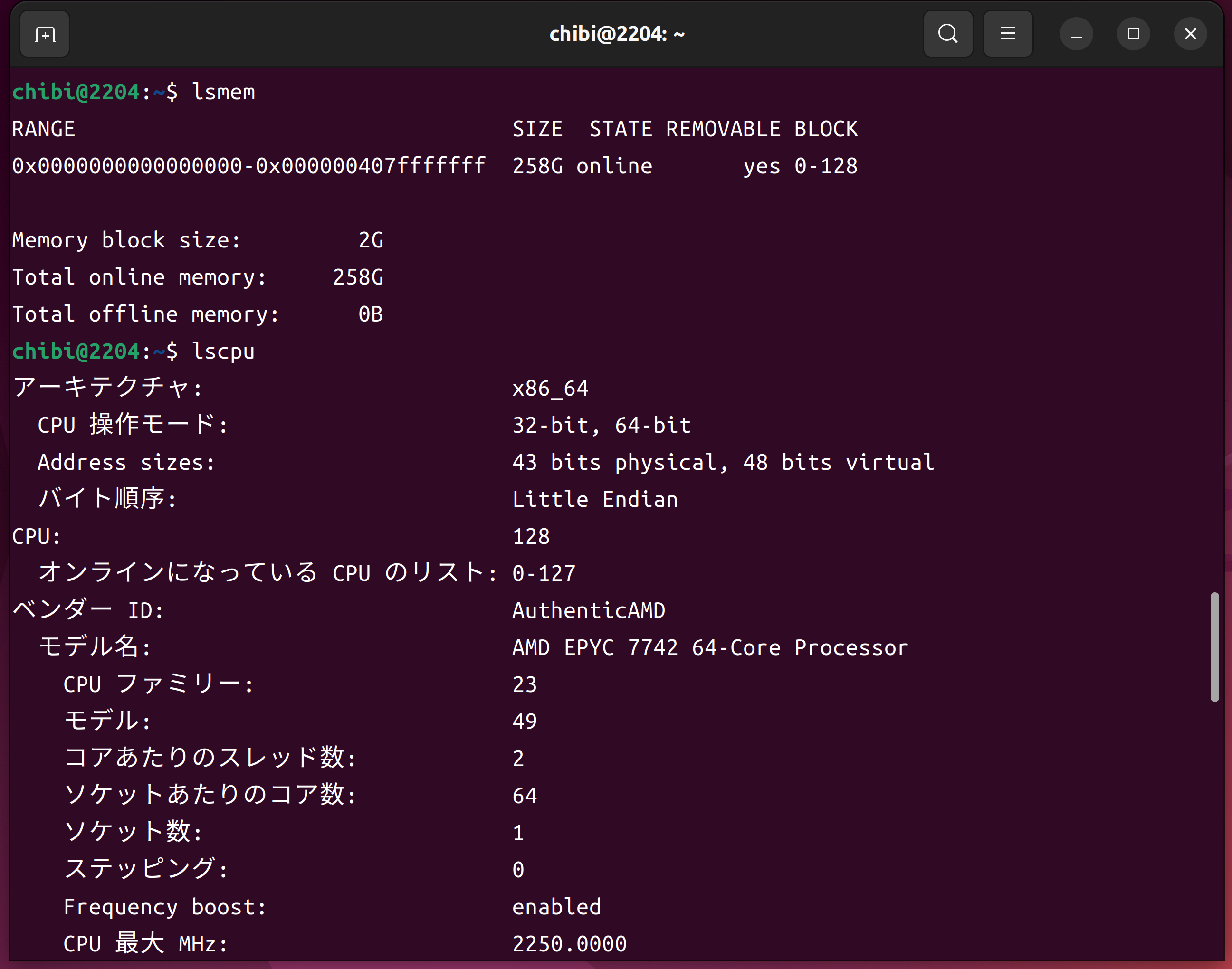 - 第2世代 AMD EPYC 7742 64-Core Processor 128Threads 256GB RTX2080Ti EDILOCA EN605 256GBで構成された Ubuntu 22.04.5 LTS へ CUDA-toolkit 12.9.1をInstall してnvidia-smi nvcc -V cat /etc/os-release sensors lsmem nvme list nvme smart-log /dev/nvme0n1 lscpuを設定してみた