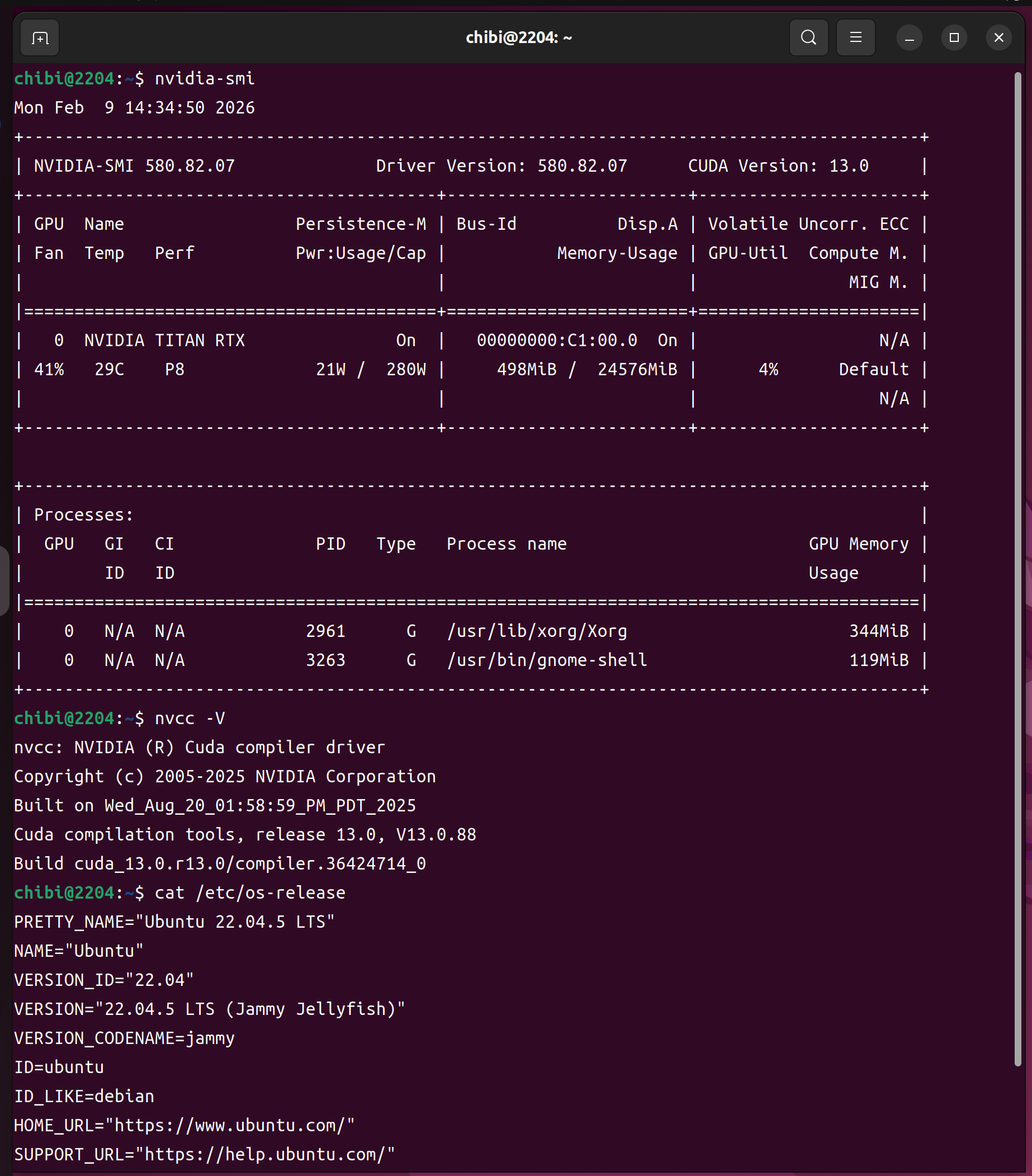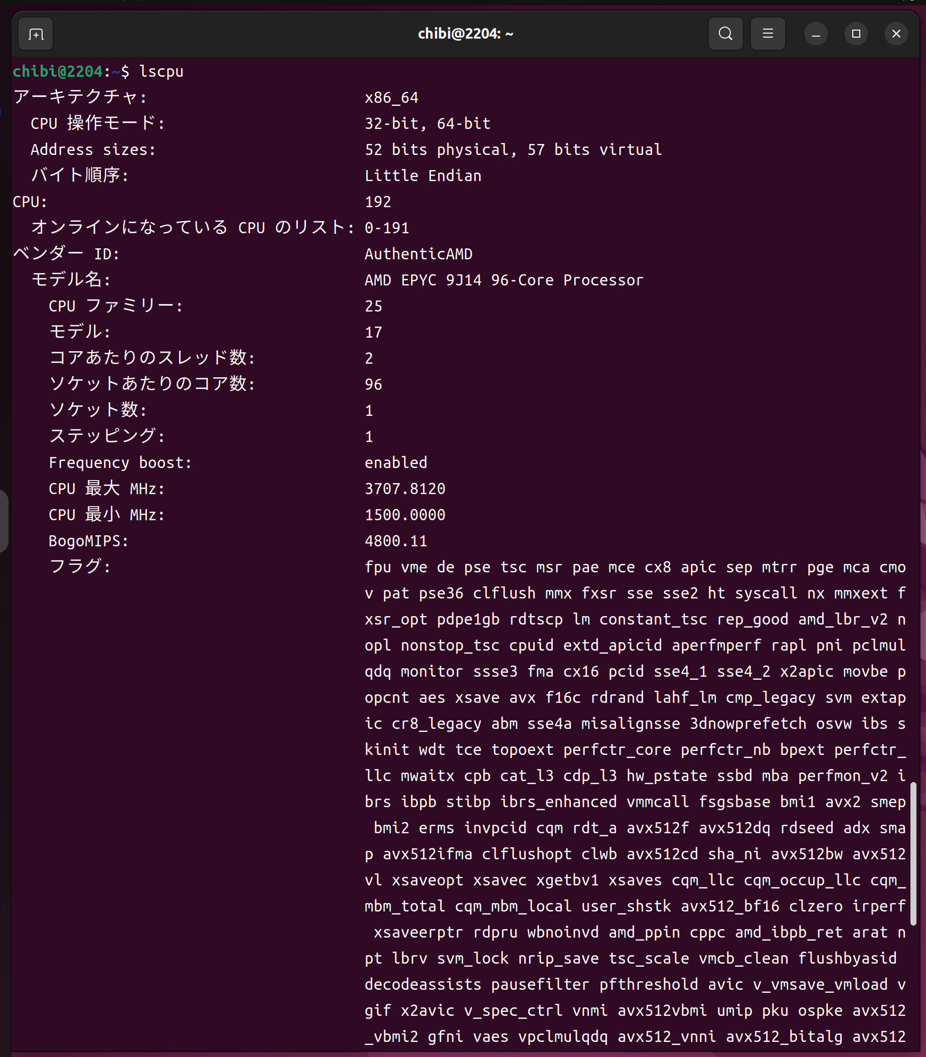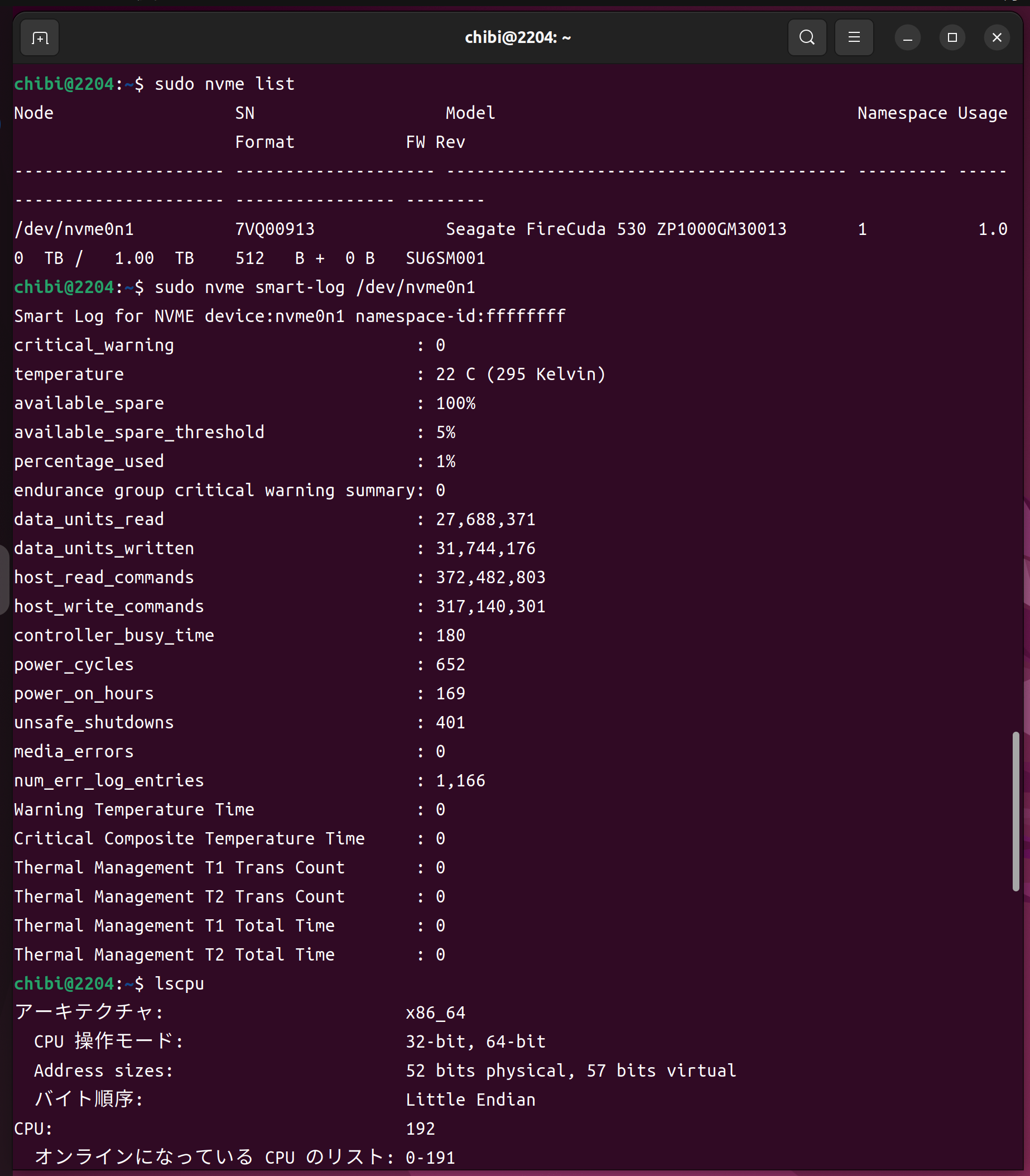 - 第4世代 AMD EPYC 9J14 96-Core Processor 192Threads 192GB TITAN RTX Seagate FireCuda 530 ZP1000GM30013 1TBで構成されたUbuntu 22.04.5 LTS へ CUDA-toolkit 13.0 をInstall してnvidia-smi nvcc -V cat /etc/os-release sensors lsmem nvme list nvme smart-log /dev/nvme0n1 lscpuを設定した