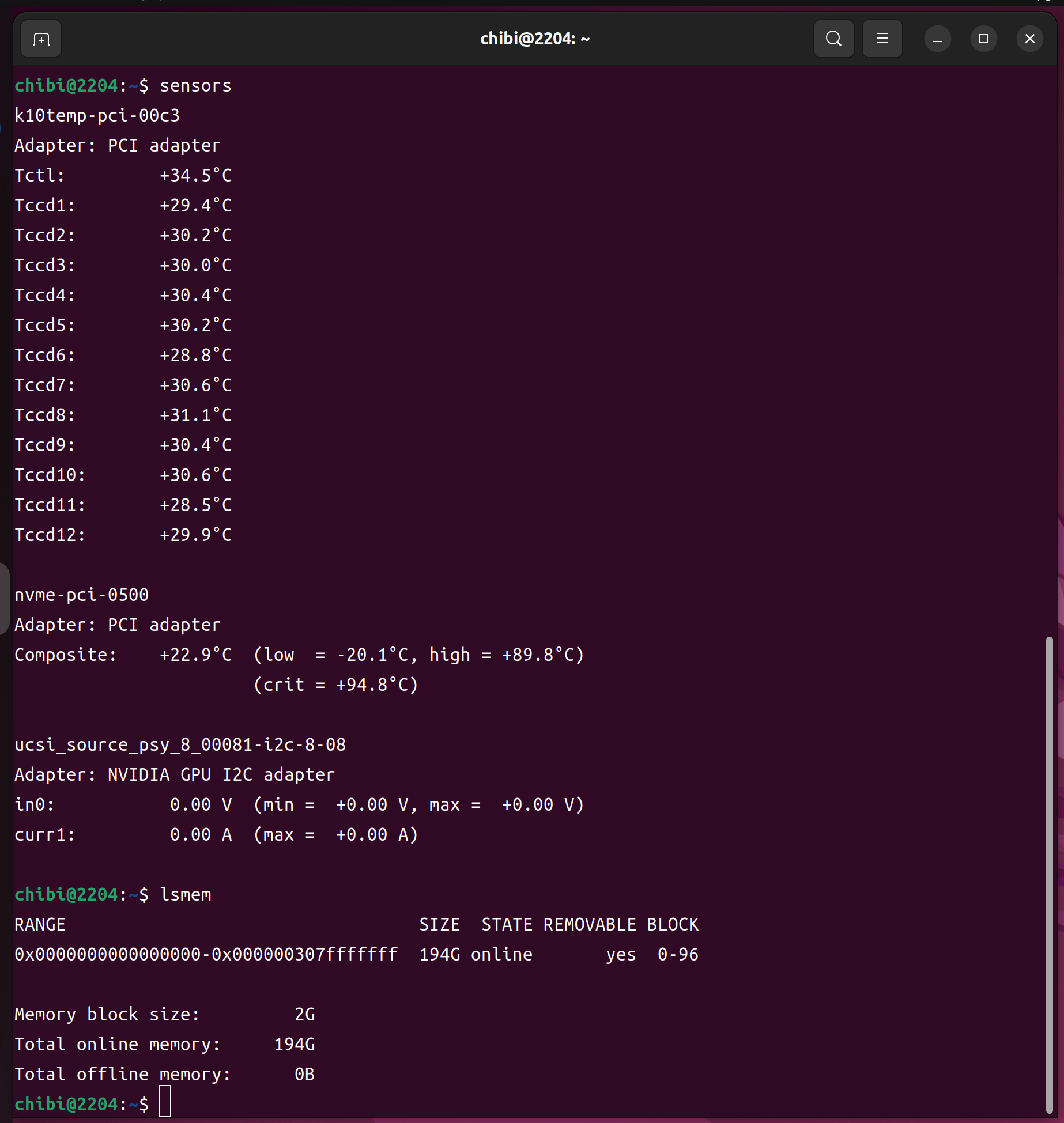 - 第3世代 AMD EPYC 7763 64-Core Processor 128Threads 128GB TITAN RTX TS256GSSD370S 256GBで構成された Ubuntu 24.04.2 LTS へ CUDA-toolkit 12.9.0をInstall してnvidia-smi nvcc -V sensors hddtemp lsmem cat /etc/os-release lscpuを設定してみた
