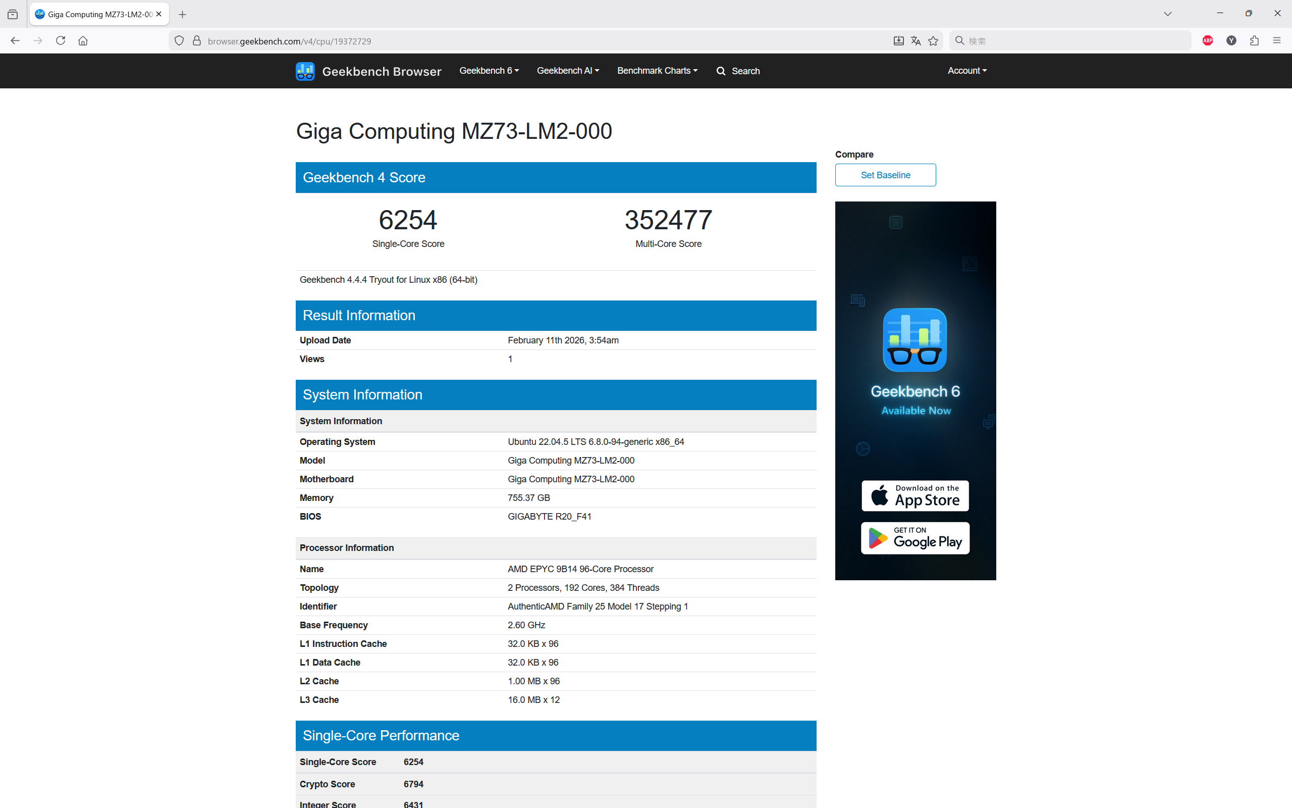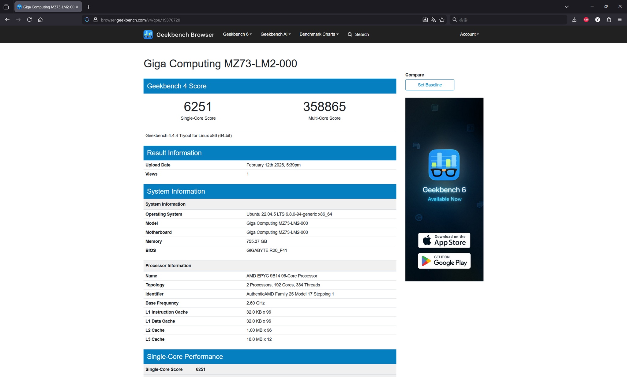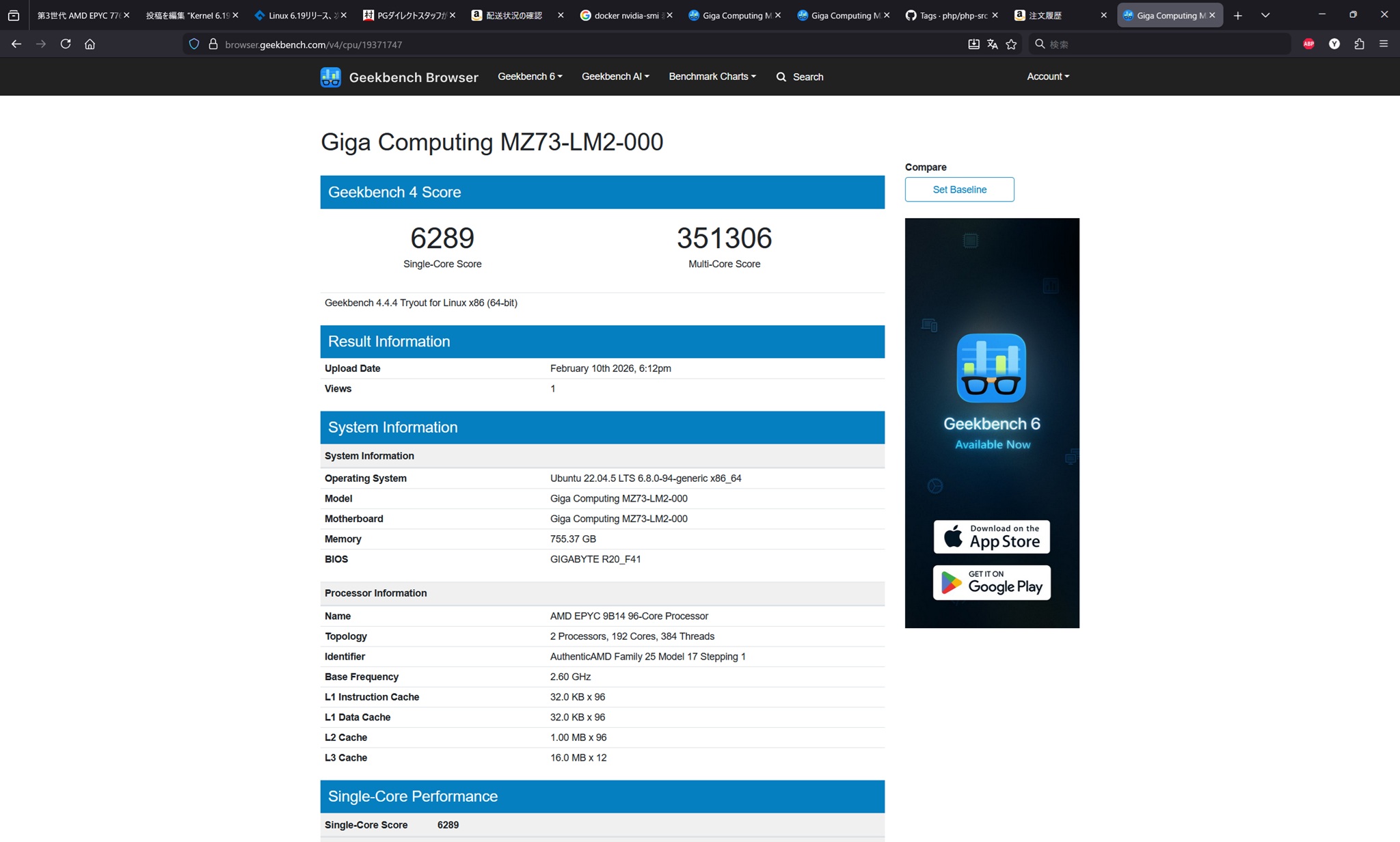 - 第4世代 AMD EPYC 9B14 96-Core Processor x2 384Threads 768GB NVIDIA TITAN RTX CT1000T710SSD8 1TB (PCIe5.0)で構成された Ubuntu22.04.5 LTS にてGeekbench-4.4.4-Linuxを久しぶりに動作させてみたMulti-Core Score 358,865