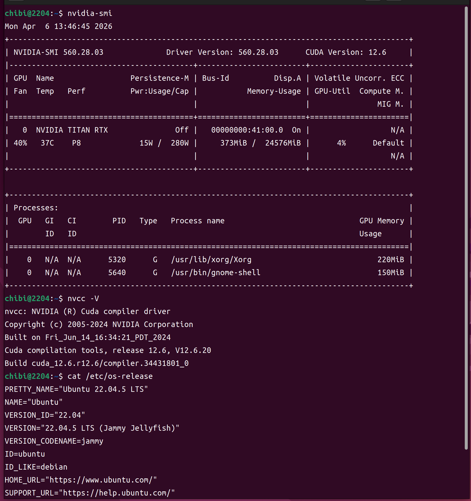 - Intel(R) Core(TM) i7-6700K CPU @ 4.00GHz 4core 8threds 32GB RTX2080Ti PLEXTOR PX-256M9PeGで構成されたUbuntu24.04.3 LTS へ CUDA-toolkit 12.5をInstall してnvidia-smi nvcc -V cat /etc/os-release sensors lsmem nvme list nvme smart-log /dev/nmve0n1 lscpuを設定 に 丸山泰男 より