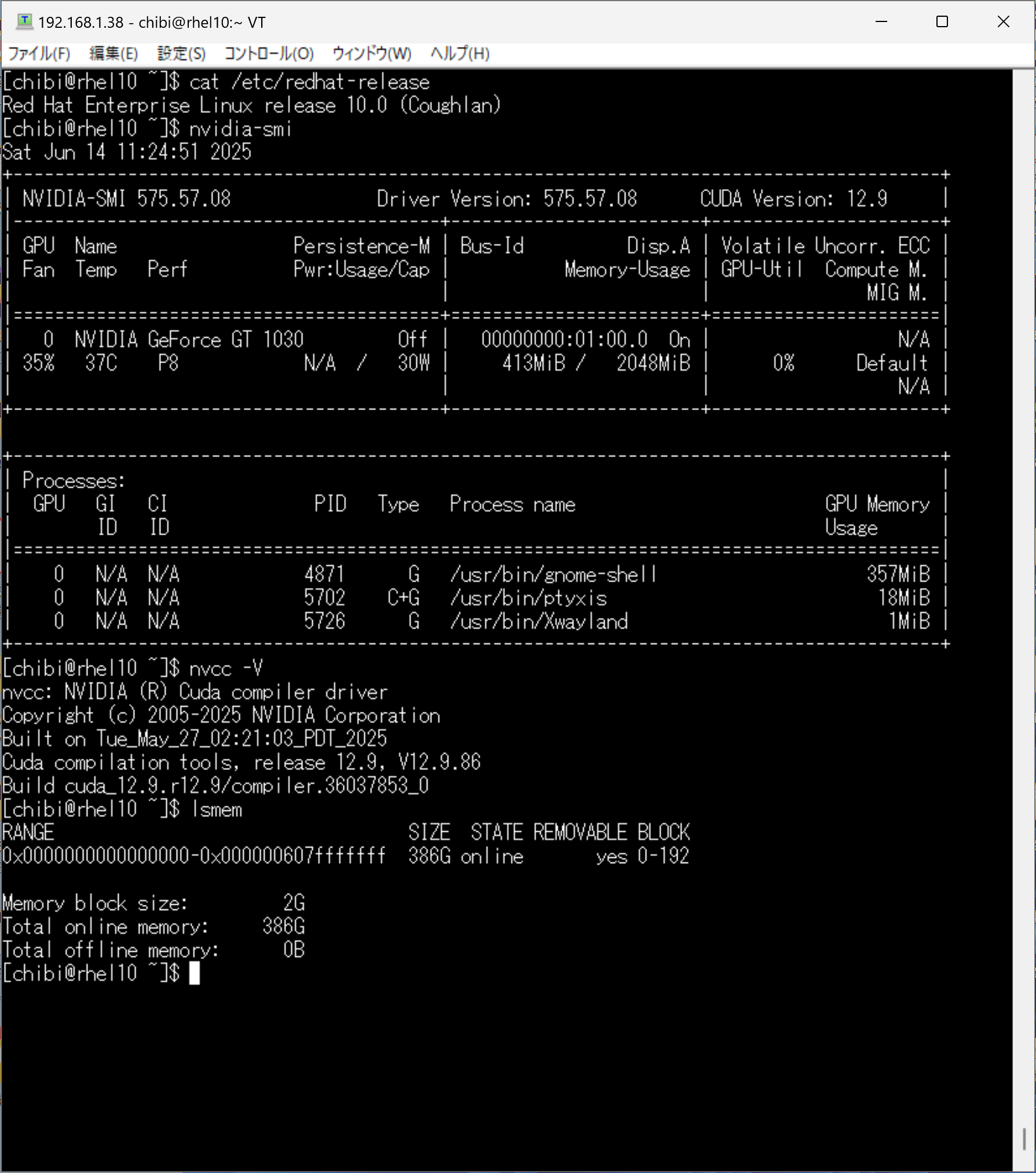 - 第2世代 AMD EPYC 7742 64-Core Processor 128Threads 256GB RTX2080Ti Fanxiang S880E 500GBで構成された Red Hat Enterprise Linux release 10 へ CUDA-toolkit 12.9.1をInstall してnvidia-smi nvcc -V cat /etc/redhat–release sensors lsmem nvme list nvme smart-log /dev/nvme0n1 scpuを設定してみた